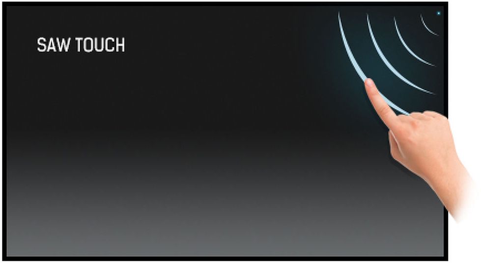 Technologia ta bazuje na falach akustycznych. W momencie dotknięcia ekranu fala dźwiękowa jest po części pochałaniana, dzięki czemu dotyk jest rejestrowany. Ponieważ ekran pokrywa warstwa szkła, technologia ta zapewia bardzo dobrą jakość obrazu (wysoki kontrast i wierne odwzorowanie kolorów). Odporność na zarysowania sprawia, że monitory w technologii SAW idealnie nadają się do zastosowań w miejscach publicznych. Co więcej – nawet jeśli ekran zostanie zarysowany, nie ma to wpływu na działania funkcji dotykowej. Monitor rozpoznaje dotyk wykonany ręką lub rysikiem z miękką końcówką.