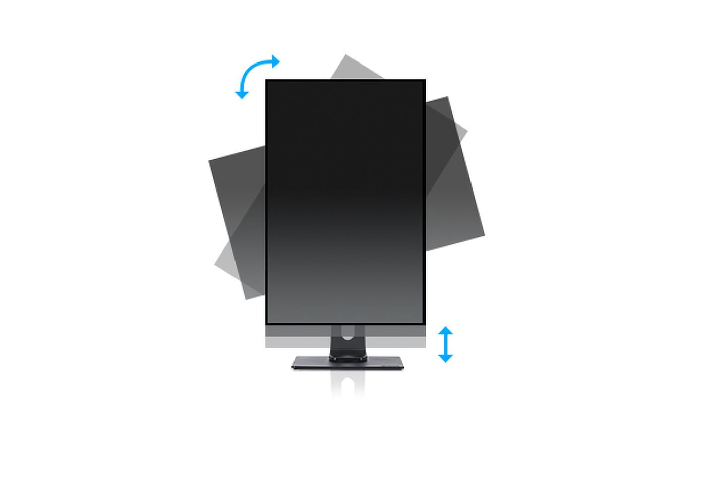 Stopka z regulacją wysokości umożliwia dostosowanie położenia ekranu do własnych preferencji. Rotacja ekranu umożliwia zmianę pozycji ekranu z poziomej (pejzaż) do pionowej (portret). To funkcja szczególnie przydatna w pracy z długimi arkuszami lub tekstem.