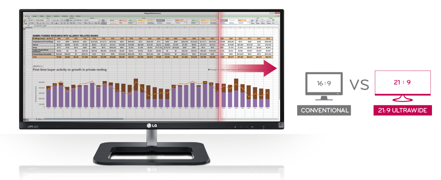UltraPanoramiczny ekran o proporcjach (2560 x1080 ) z powodzeniem zastępuje 2 tradycyjne monitory ułatwiając użytkownikowi dostrzeżenie i efektywną analizę danych. Szerokie horyzonty monitora 21:9 ułatwiają analitykom i bankierom śledzenie dużych ilości informacji przy użyciu wielu narzędzi w tym samym czasie. UltraPanoramiczny monitor o proporcjach ekranu 21:9 to doskonała alternatywa dla Twoich dotychczasowych wyświetlaczy współpracujących ze stacjami graficznymi czy używanymi w pracy z wieloma dokumentami na raz.