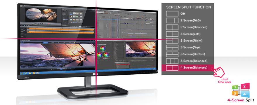 Profesjonalny monitor LG IPS 29EB73 umożliwia wyświetlenie do 4 niezależnych ekranów w 8 różnych ustawieniach. Rozmiar monitora sprawia, że nawet podział na 4 okna nie wywołuje wrażenia ścisku. Teraz masz szansę na naprawdę efektywną i wygodną wielozadaniową pracę dostępną za pomocą tylko jednego kliknięcia.