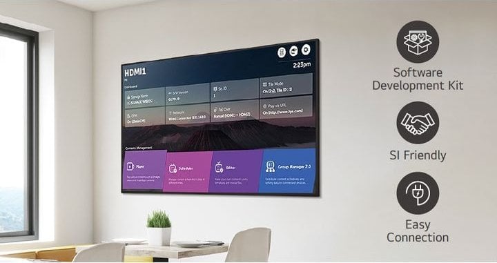 UH7N-E jest wyposażony w wysokowydajny SoC, który pozwala na wykonywanie wielu zadań bez potrzeby stosowania oddzielnego odtwarzacza multimedialnego. Platforma webOS zapewnia narzędzia do tworzenia aplikacji z intuicyjnym interfejsem użytkownika, co zwiększa wygodę użytkowania, umożliwiając łatwe połączenie z zewnętrznymi czujnikami i aplikacjami partnerów webOS, tworząc przyjazne środowisko dla integratorów systemów (SI).