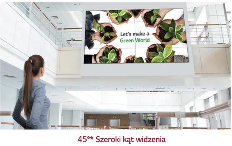 Duże ekrany zazwyczaj umieszcza się powyżej poziomu wzroku, przez co w ścianach wideo znaczenia nabiera jednolita jakość obrazu. Kąt widzenia w urządzeniach 49VL5F pozwala zachować żywe kolory bez jakichkolwiek zniekształceń.