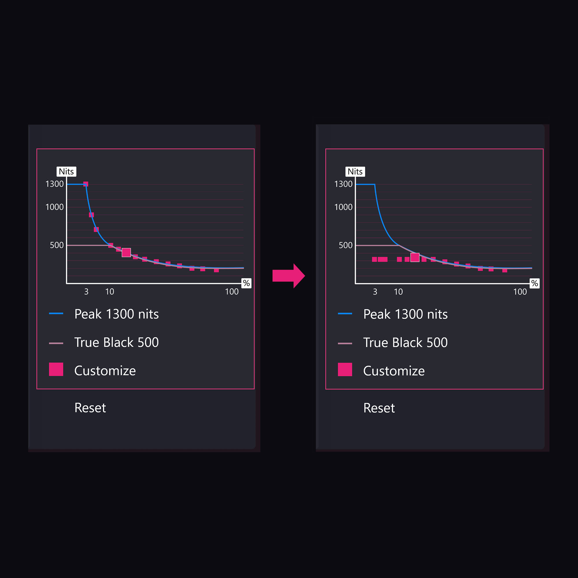 Jednolita luminancja minimalizuje efekt automatycznego ograniczania jasności ABL (Auto Brightness Limiter), zapewniając płynne przejścia między jasnymi i ciemnymi scenami w filmach i grach HDR. W efekcie eliminowane są nagłe i niepożądane wahania poziomu jasności.