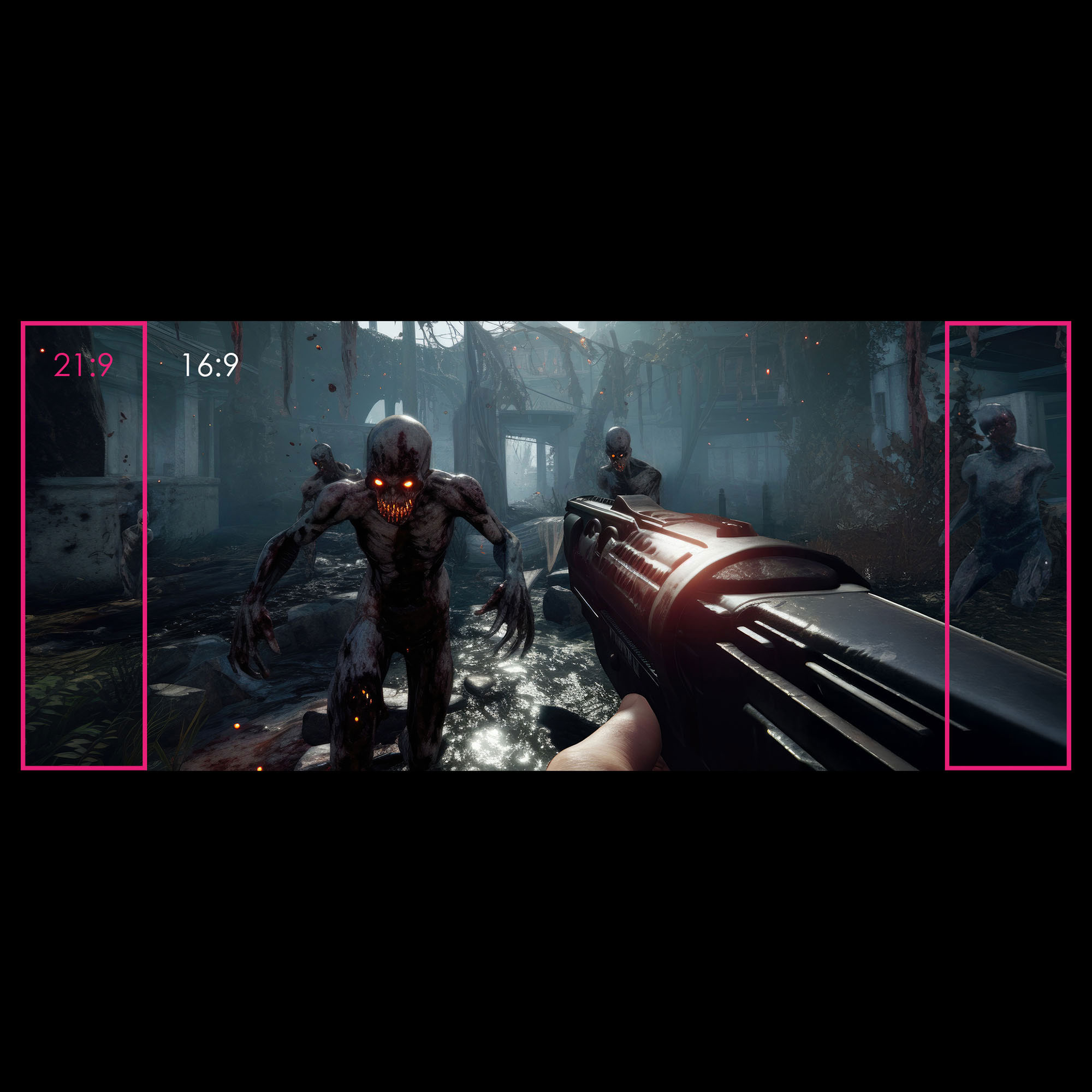 Ultraszeroki format 21:9 znacząco wzbogaca wrażenia z rozgrywki, oferując znacznie szersze pole widzenia (FOV, Field of View) niż standardowy format 16:9. Przekłada się to na realną przewagę w grze, umożliwiając lepsze dostrzeganie akcji rozgrywającej się na obrzeżach ekranu.