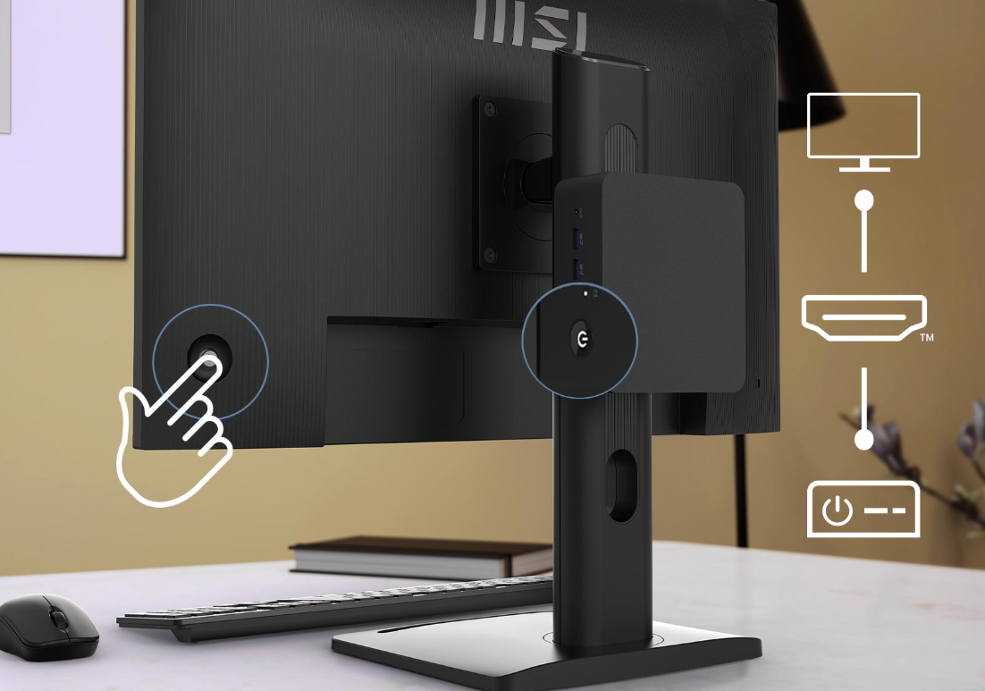 Konstrukcja obudowy monitora pozwala na bezproblemowe zamocowanie na niej komputera Mini-PC z serii Cubi, co pomaga w uporządkowaniu miejsca pracy. Funkcja MSI Power Link, której obsługa realizowana jest poprzez złącze zgodne ze standardem HDMI™ CEC daje zaś możliwość włączenie komputera Mini-PC za pomocą przycisku zasilania monitora, zwiększając w ten sposób wydajność i komfort użytkowania.