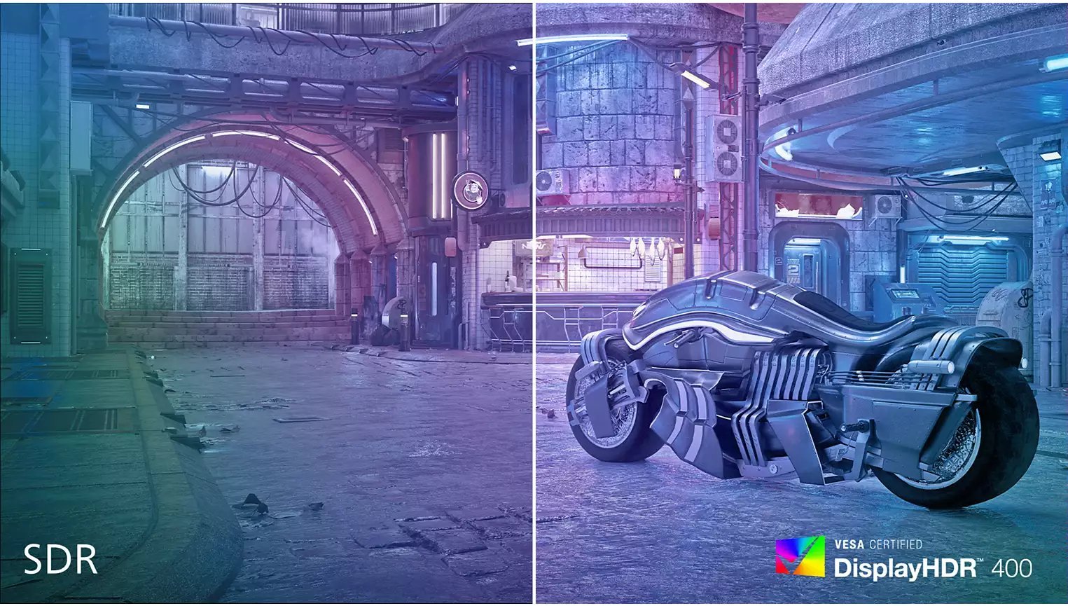 Certyfikat VESA DisplayHDR 400 to technologia gwarantująca zupełnie nową jakość oglądania w porównaniu ze standardowymi monitorami SDR. W odróżnieniu od innych monitorów „zgodnych z technologią HDR”, prawdziwe wyświetlacze z certyfikatem DisplayHDR 400 zapewniają zadziwiającą jasność, niezrównany kontrast i zniewalające kolory. Dzięki funkcji globalnego przyciemniania i minimalnej jasności sięgającej 400 nitów obraz ożywa — jasne kolory są o wiele jaśniejsze, a ciemne jeszcze głębsze i bardziej zniuansowane. Pełniejsza paleta nowych, żywych barw sprawia, że oglądanie staje się inspirującym przeżyciem angażującym zmysły.