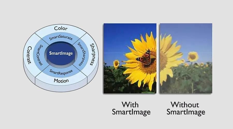 SmartImage to najnowsza, ekskluzywna technologia firmy Philips, która analizuje zawartość wyświetlaną na ekranie i zapewnia zoptymalizowaną wydajność wyświetlacza. Ten przyjazny dla użytkownika interfejs umożliwia wybór różnych trybów, takich jak: Biuro, Zdjęcia, Filmy, Gry, Oszczędność itd. w celu dopasowania używanej aplikacji. W oparciu o ten wybór technologia SmartImage dynamicznie optymalizuje kontrast, nasycenie kolorów i ostrość zdjęć i filmów w celu zapewnienia najlepszej wydajności wyświetlacza. Tryb Oszczędność pozwala oszczędzić energię. A wszystko to w czasie rzeczywistym za naciśnięciem jednego przycisku!