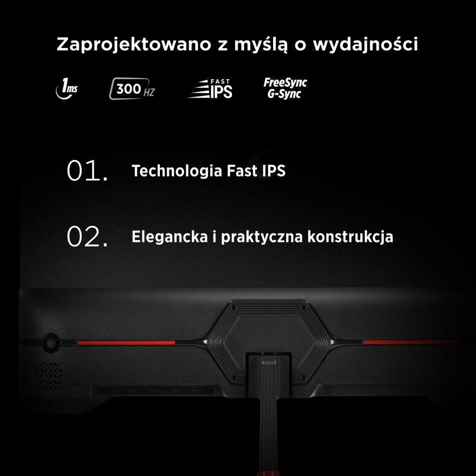 Monitor wygląda równie dobrze, jak działa. Czerwono-czarna konstrukcja z LED-owym podświetleniem idealnie wpisuje się w gamingowe stanowisko. Wbudowane głośniki o łącznej mocy 2 W i wyjście słuchawkowe sprawiają, że nie potrzebujesz dodatkowego sprzętu, by cieszyć się rozgrywką.