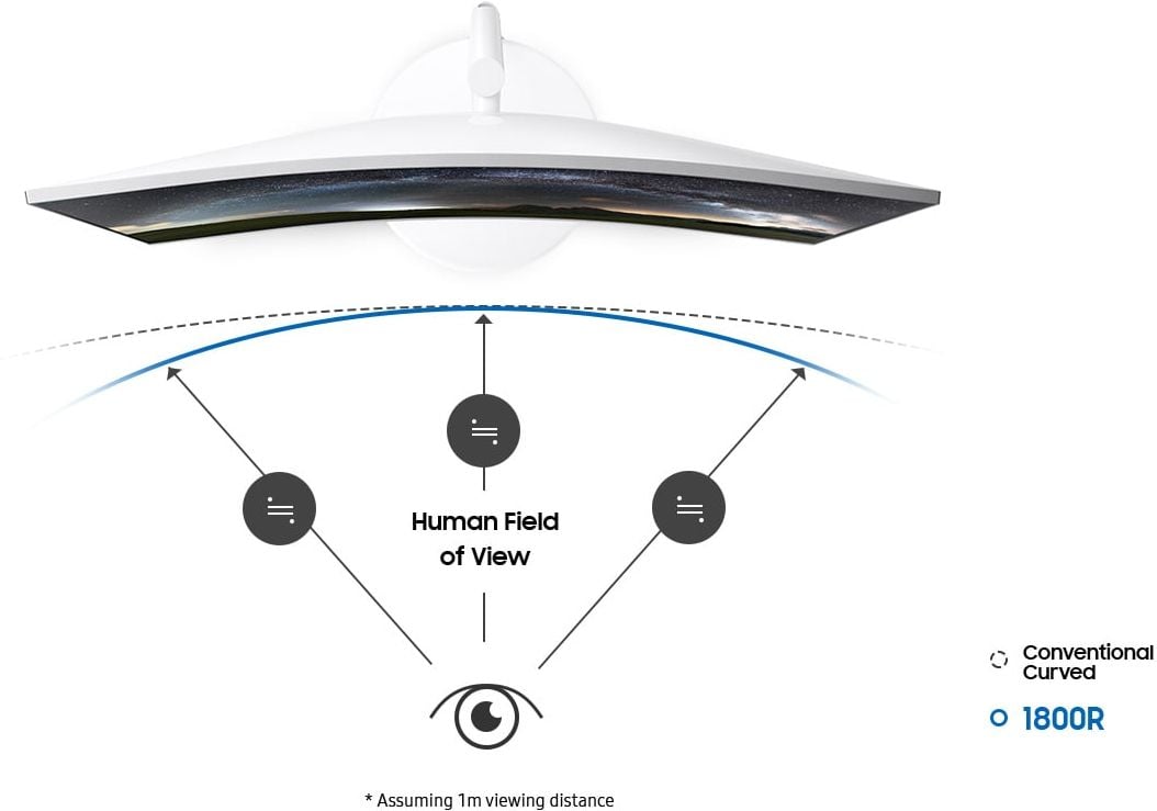 Monitor 1800R Samsung o największej krzywiźnie wśród monitorów dostępnych na rynku został zaprojektowany tak, aby zapewnić szerokie pole widzenia i głębię podczas oglądania filmów, co gwarantuje prawdziwy panoramiczny obraz.