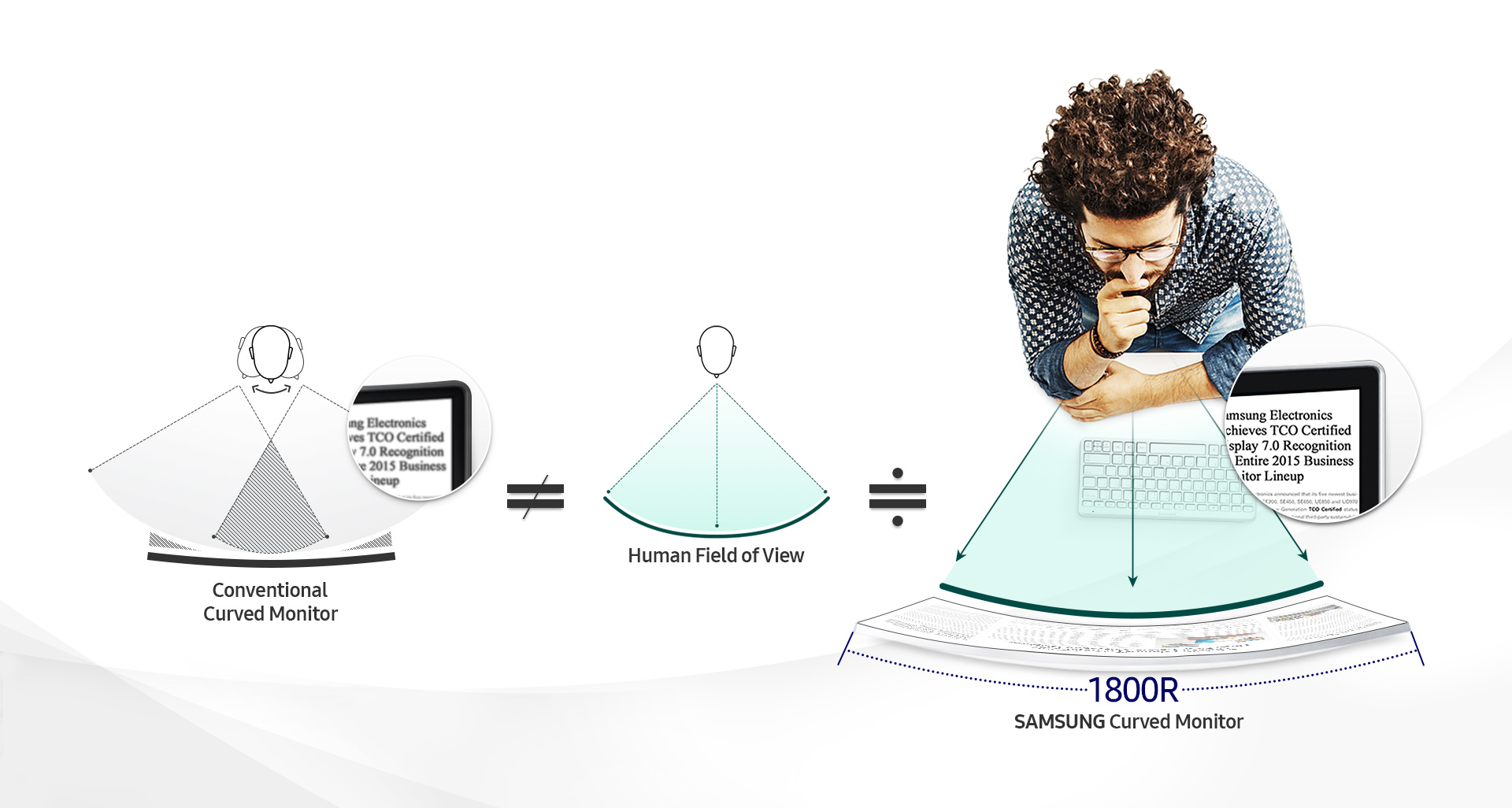 Ekran Samsung o zakrzywieniu 1800 R o wiele naturalniej dopasowuje się do zakresu pola widzenia ludzkiego oka niż zwykły,płaski monitor. Dzięki temu łatwiej można skupić spojrzenie i śledzić akcję wyświetlaną na monitorze. Wszystko to przekłada się na większy komfort oglądania i mniejsze zmęczenie wzroku,co zostało potwierdzone w badaniach klinicznych przeprowadzonych przez Wydział Okulistyki Narodowego Szpitala Uniwersyteckiego w Seulu.