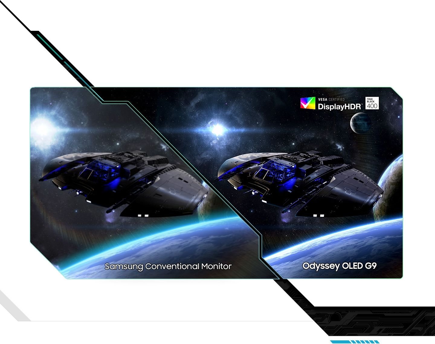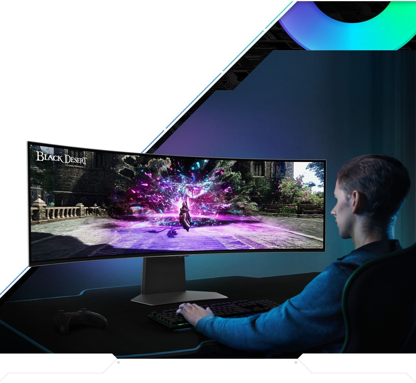 Ogromne światy dosłownie otulają gracza dzięki super ultraszerokiemu polu widzenia. Ekran o szerokości dwóch monitorów o wysokiej rozdzielczości zapewnia maksymalną przestrzeń i ostrą widoczność wszystkich szczegółów. Wrażenia wzmacnia zakrzywienie na planie koła o średnicy 1,8 m (1800R), która sprawia, że obraz otacza i pozwala się wcielić w postać z gry.