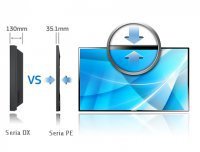 Obudowy monitorów z serii PE są o 73% cieńsze w porównaniu z tradycyjnymi produktami, dzięki czemu wyglądają zgrabniej. Lekka konstrukcja zajmuje mniej miejsca, ułatwiając montaż. Wąska ramka umożliwia oglądającym skoncentrowanie się na oglądanej zawartości i zapewnia większą powierzchnię dla wyświetlanych informacji. Dzięki smukłej ramce można tworzyć perfekcyjne ściany wideo z niemal niewidocznymi połączeniami.