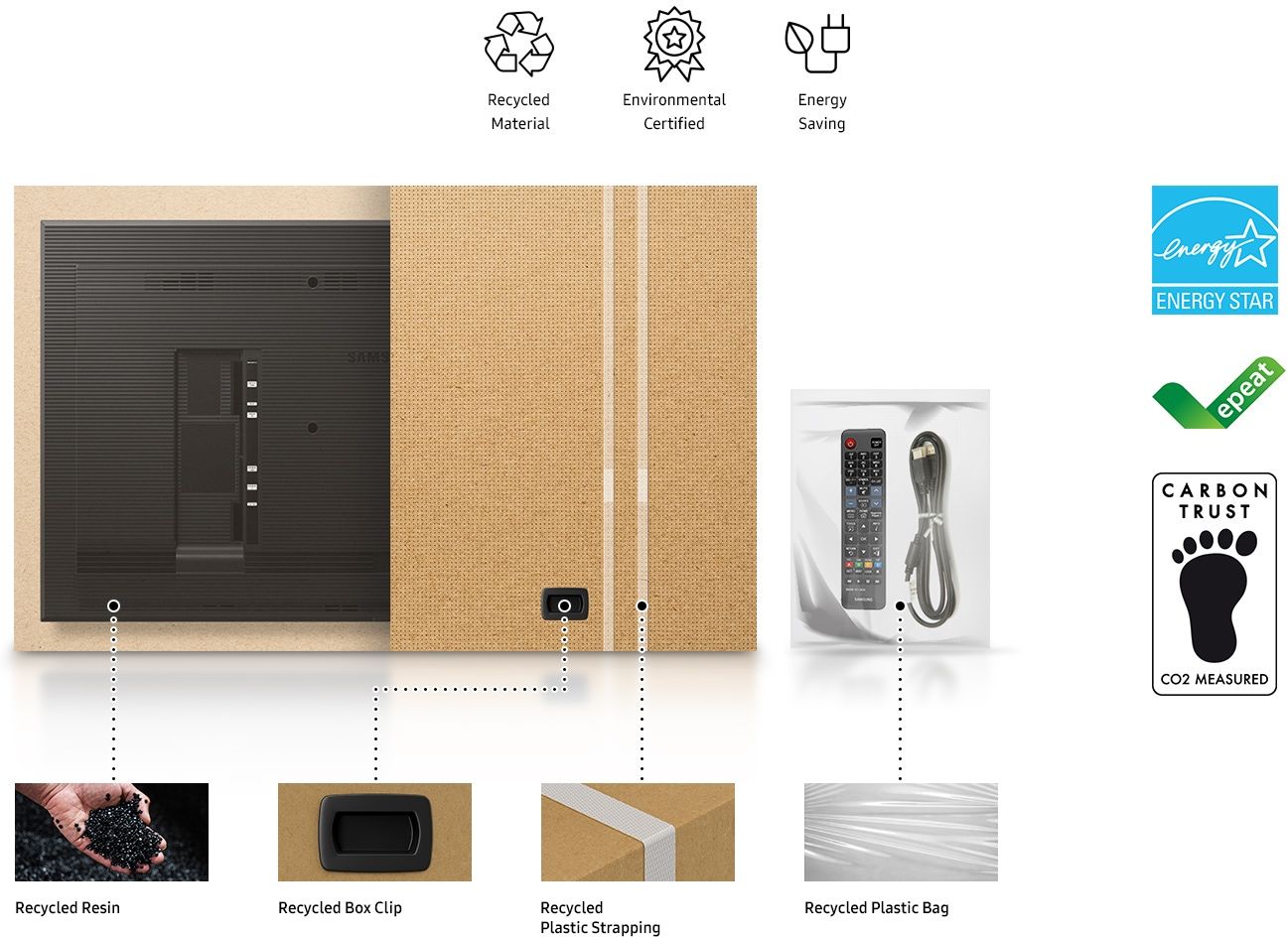 Obudowa i opakowanie ekranu z serii QHB są wykonane z tworzyw. Ponadto firma Samsung posiada certyfikaty potwierdzające oszczędne zużycie energii i redukcję śladu węglowego oraz spełnia wymagania prawne dotyczące ograniczania użycia substancji niebezpiecznych, takie jak RoHS, REACH i WEEE.