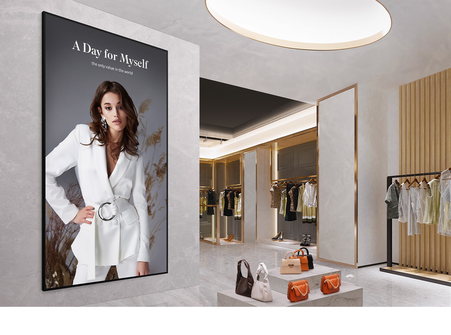Zdefiniuj na nowo i zoptymalizuj swoją przestrzeń dzięki eleganckiej i smukłej konstrukcji. Dzięki głębokości 48,1 mm i wadze 56,3 kg, jest to najcieńszy 98-calowy wyświetlacz w swojej klasie. Skierowane na zewnątrz porty pozwalają na płaski montaż na ścianie, co wpływa na maksymalną oszczędność miejsca. Minimalistyczny design sprawia, że QH98C jest niezwykle efektowny.