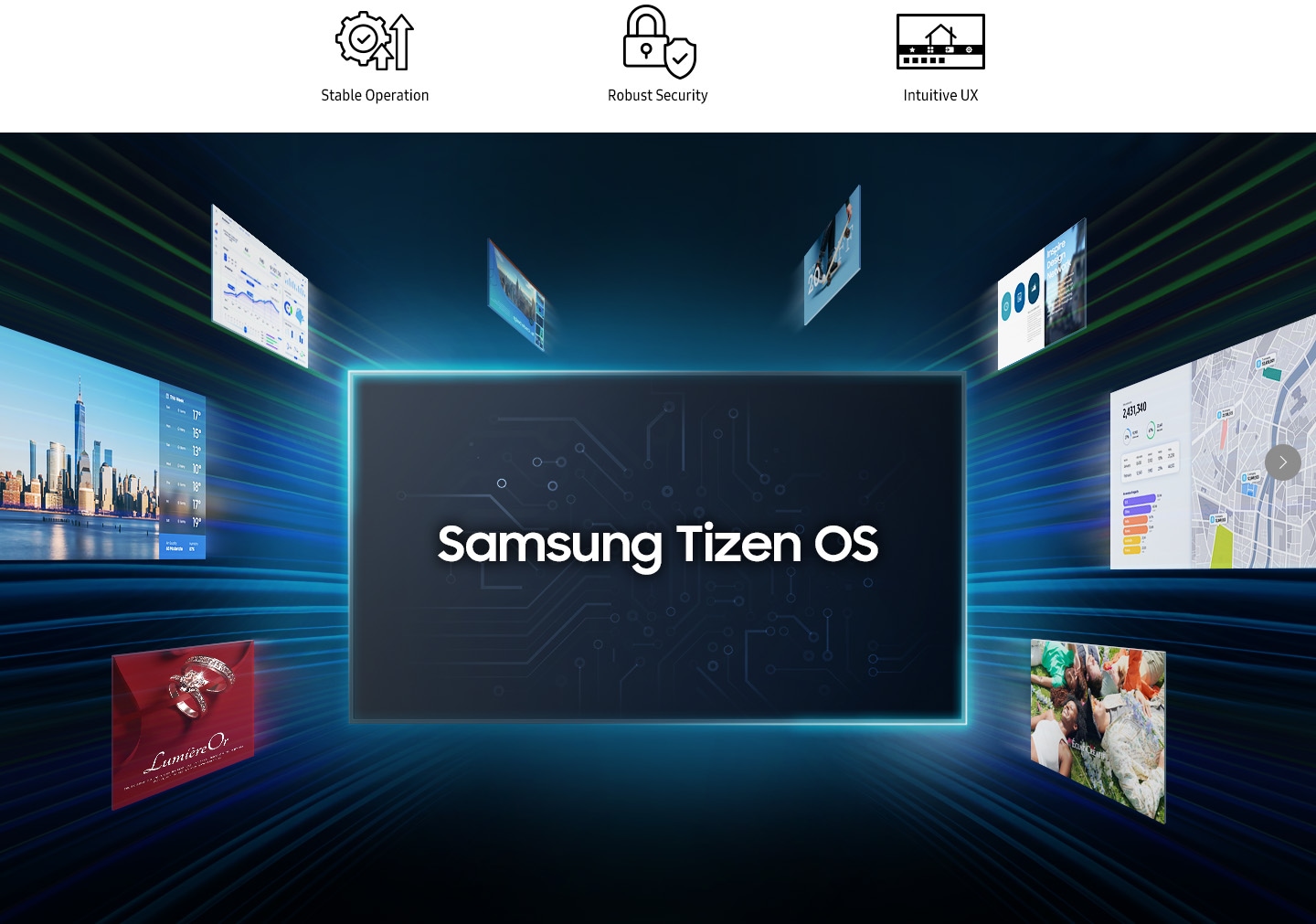 Stabilność i bezpieczeństwo systemu operacyjnego Tizen, podnosi wydajność i wrażenia użytkownika oraz zapewnia płynne działanie dla zaspokojenia potrzeb biznesowych. Dzięki ciągłym aktualizacjom, dostępne są nowe funkcje, które podnoszą jakość rozwiązań signage.