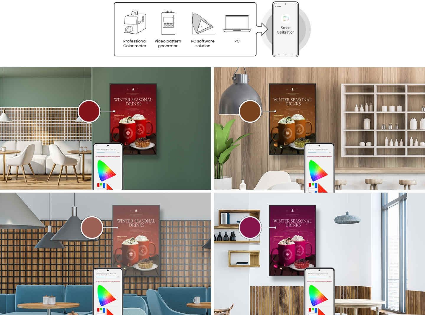 Pełna spójność marki na każdym ekranie w każdej lokalizacji. Korzystając z aplikacji mobilnej Samsung, inteligentna kalibracja pomaga zapewnić prawidłową kalibrację każdego wyświetlacza, wyświetlając logo marki i inne materiały dodatkowe w dokładnie wymaganych kolorach.