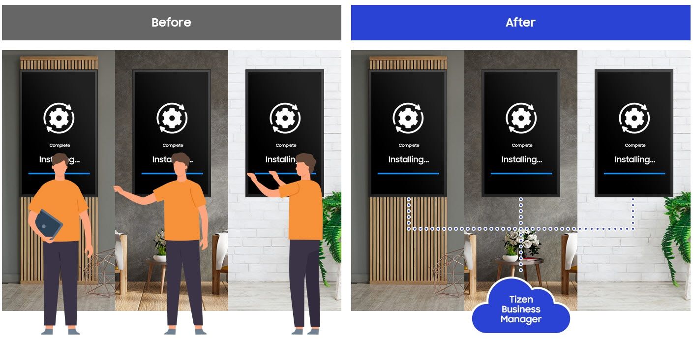 Aplikacja Tizen Zero Config jest niezbędna zarówno dla pracowników IT, którzy obsługują wiele ekranów w różnych lokalizacjach. Prostotę instalacji zapewnia wstępna konfiguracja zdefiniowanej listy funkcji konfiguracji wyświetlania. Po instalacji wyświetlaczy specjaliści IT mogą łatwo kontrolować wyświetlacze i zarządzać nimi za pośrednictwem portalu Tizen Business Manager. Wszystko to można zrobić zdalnie, aby wyeliminować niepotrzebne podróże.