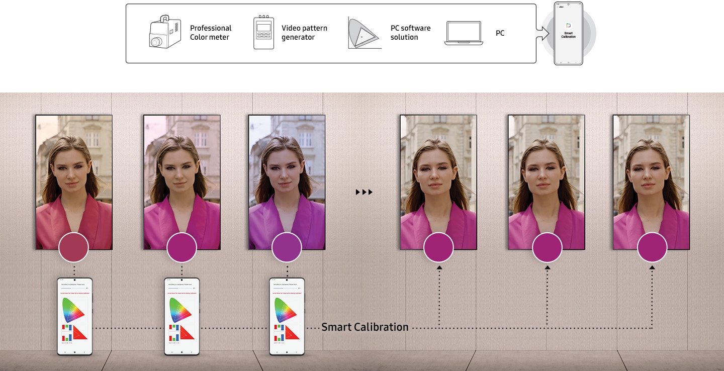 Zagwarantuj pełną spójność marki na każdym wyświetlaczu w każdej lokalizacji. Korzystając z aplikacji mobilnej Samsung, Inteligentna Kalibracja zapewnia odpowiednią kalibrację każdego wyświetlacza, prezentując logo marki i inne materiały w dokładnie wymaganych kolorach.