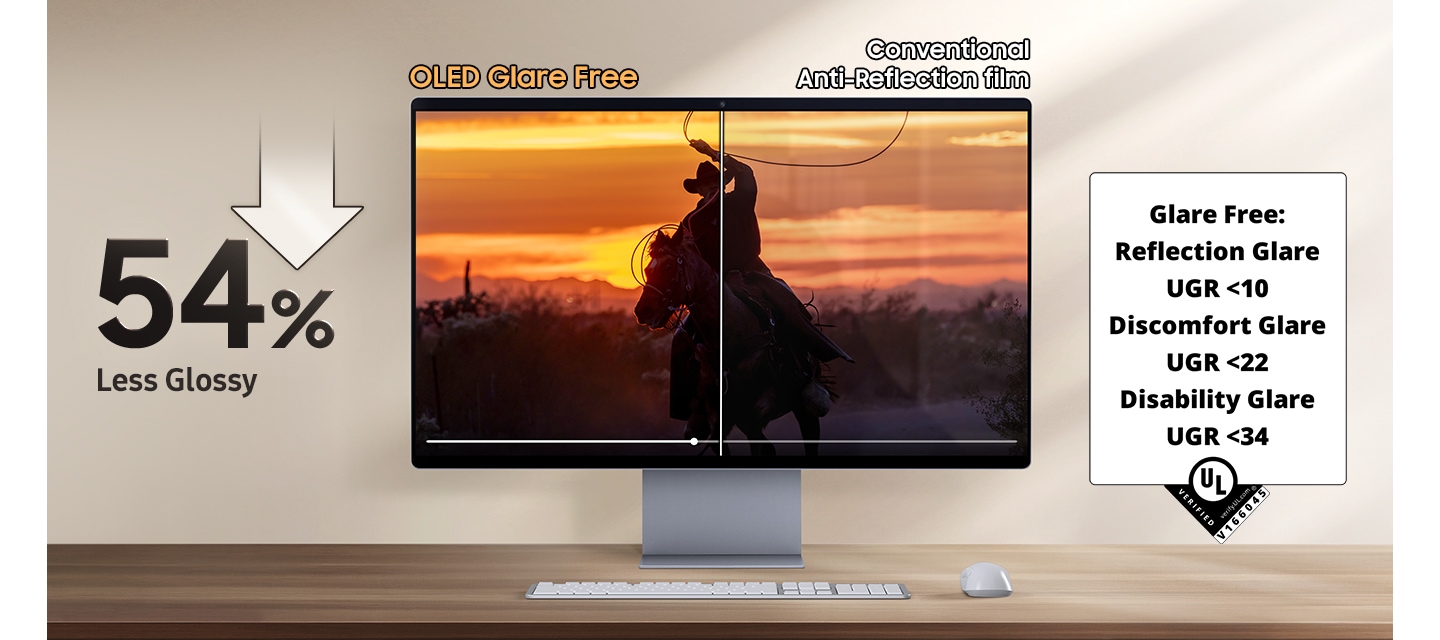Uzyskaj wciągające wrażenia podczas oglądania dzięki technologii Glare Free. Technologia Samsung Glare Free jest o 54% mniej błyszcząca niż konwencjonalna powłoka antyrefleksyjna, dzięki czemu redukuje odblaski z zewnętrznych źródeł światła. Oglądaj ulubione filmy i programy z większą wyrazistością, doskonałą czernią i żywymi kolorami.
