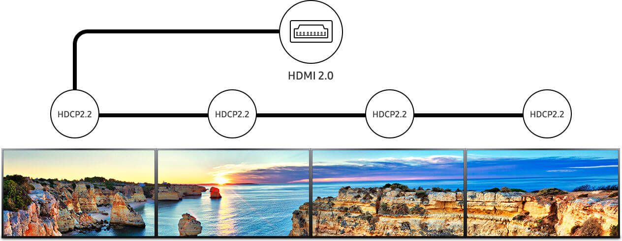 Aby zwiększyć elastyczność, seria QMN oferuje użytkownikom złącza HDMI 2.0 i DP 1.2. Ta wszechstronność zapewnia stałe 60 Hz. częstotliwość odświeżania i optymalna klarowność niezależnie od źródła. Dodatkowo użytkownicy mogą konfigurować łańcuchy UHD o rozmiarach do 2x2 za pośrednictwem portu HDMI 2.0.