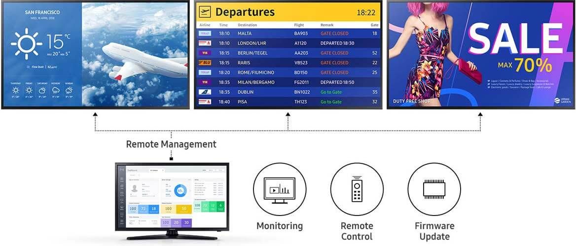 Poza bezpieczeństwem i zarządzaniem zawartością, użytkownicy QMN Series mogą ufać zdalnemu zarządzaniu wyświetlaczami w celu szybkiego i skutecznego ograniczania problemów. Użytkownicy mogą monitorować i diagnozować nieprawidłowości - zarówno samodzielnie, jak i przy pomocy Centrum Operacyjnego Sieci 24/7 firmy Samsung - z dowolnej lokalizacji.