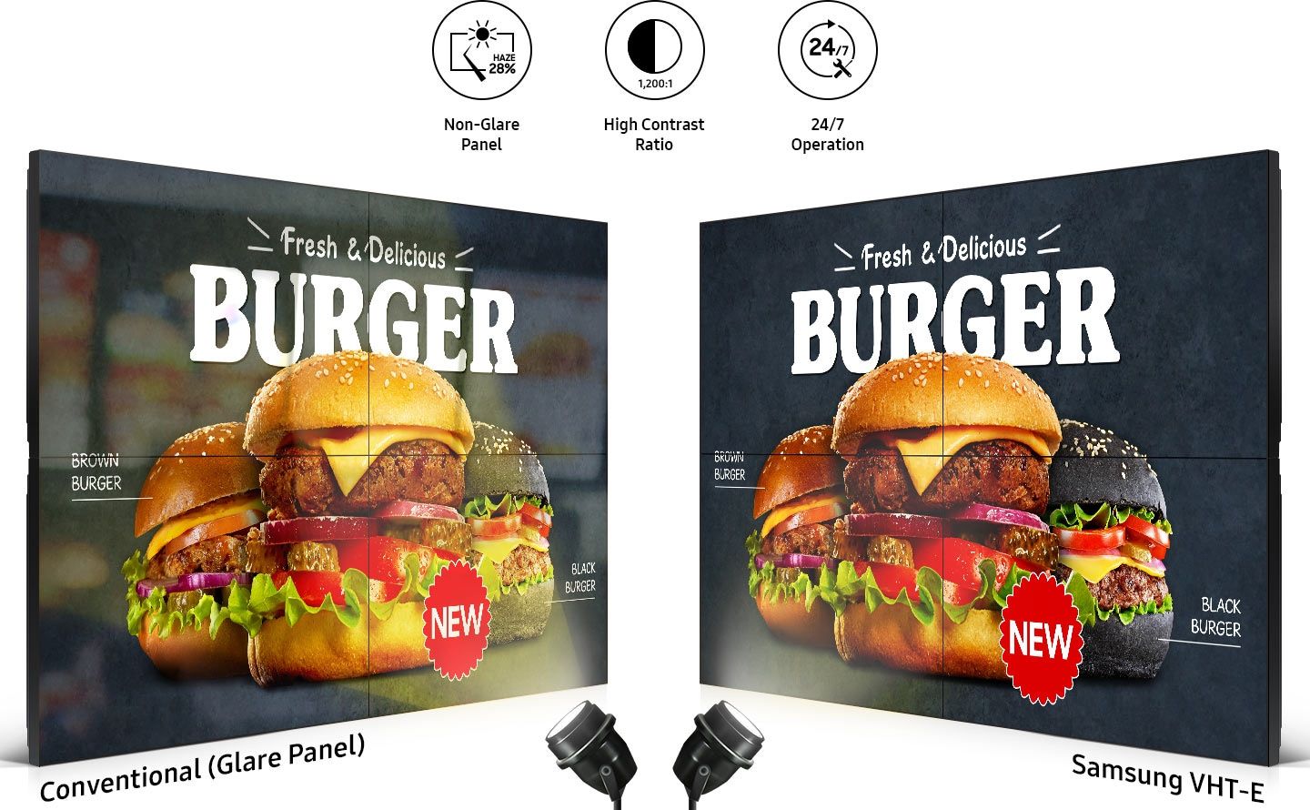 Wciągające wrażenia wizualne i niezawodność pracy w trybie 24/7 dzięki serii VHT-E firmy Samsung. Niewielka grubość wyświetlaczy i jasność 700 nitów zapewniają prezentację doskonale widocznych obrazów i czytelnego tekstu w różnorodnych lokalizacjach – od centrów handlowych przez lobby i sale zebrań po centra zarządzania.