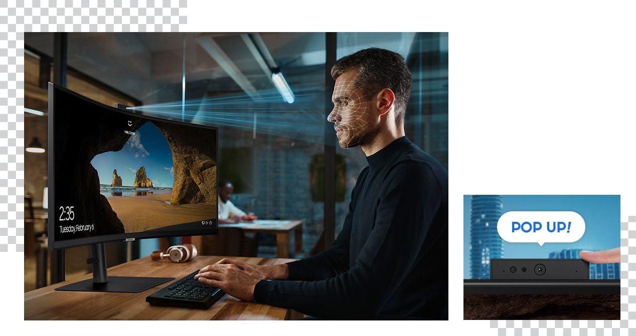Pozostań w kontakcie poprzez połączenia wideo i streamowanie, które nie wymagają dodatkowych urządzeń. Kamerę można schować, aby zachować smukłość monitora. Funkcja Windows Hello wykorzystuje kamerę oraz dane biometryczne w celu bezpiecznego zalogowania na każdym urządzeniu z Windows 11, aplikacji lub stronie internetowej bez konieczności wpisywania hasła.