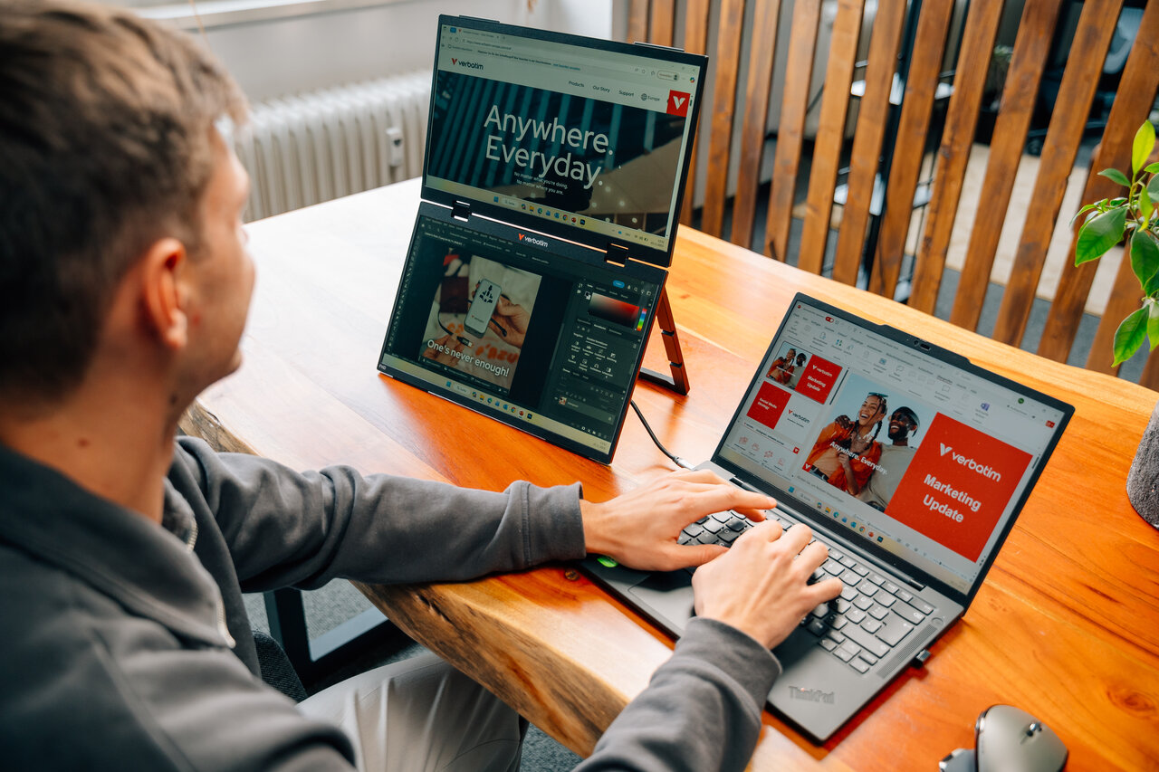 Niezależnie od tego, czy jesteś w biurze, pracujesz w domu, czy w podróży, Verbatim Portable 15.6" FHD Dual Monitor Essentials oferuje elastyczne, kompaktowe rozwiązanie do rozszerzenia przestrzeni roboczej. Wyposażony w dwa pionowo ułożone ekrany i obsługę wielu trybów wyświetlania - w tym Extend*, Duplicate i Ultra Mode (tylko Windows) - płynnie dostosowuje się do Twojego przepływu pracy. Zmaksymalizuj swoją produktywność bez uszczerbku dla przestrzeni dzięki smukłej i lekkiej konstrukcji.