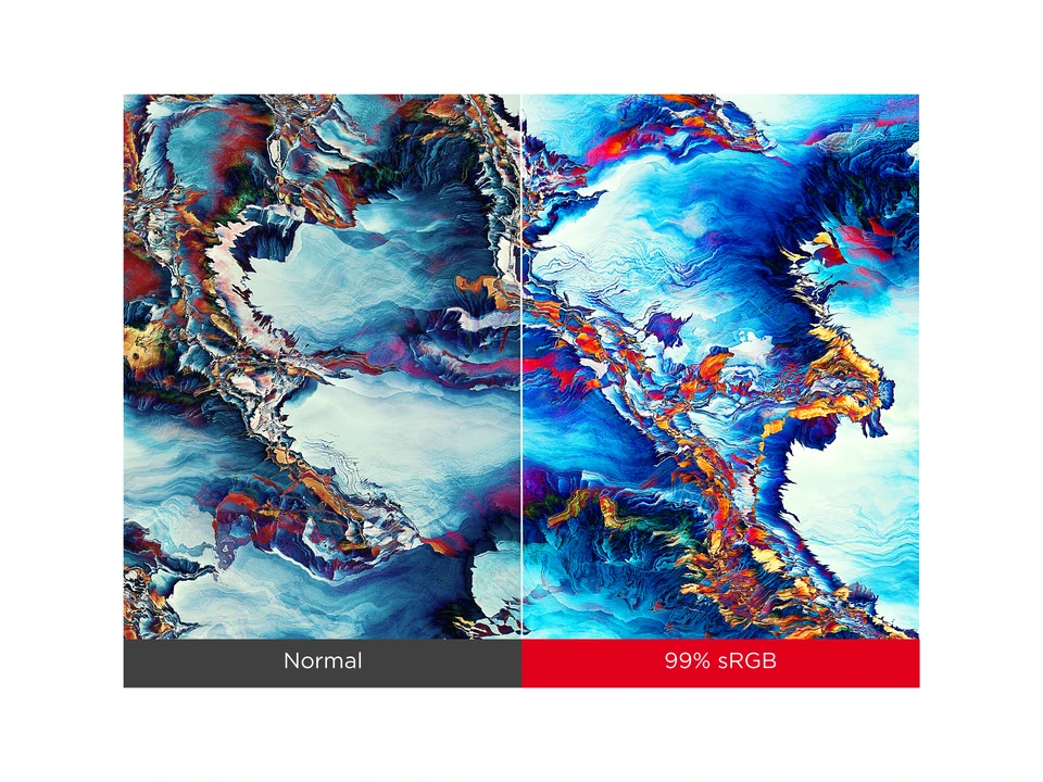 Panel z pokryciem gamy sRGB na poziomie 99% reprodukuje bogatsze i żywsze barwy, zapewniając pełną zgodność obrazu z branżowymi standardami kolorystycznymi.