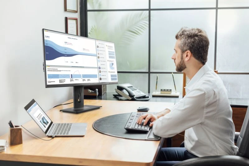 ViewSonic VG2748A-2K to 27-calowy monitor biznesowy QHD (2560 x 1440), zaprojektowany tak, aby podnosić produktywność, komfort i efektywność energetyczną w nowoczesnych miejscach pracy. Posiada siedem inteligentnych trybów sensorycznych, które poprawiają komfort oglądania, chronią prywatność i wspierają dobrostan użytkowników przez cały dzień pracy. W pełni regulowany, ergonomiczny podstawek pozwala na optymalną pozycję z regulacją przechylenia, obracania, obrotu i wysokości. Wyposażony w hub USB 3.2 (1 USB-B upstream, 3 USB-A i 1 USB-C downstream z zasilaniem 15W), a także w wejścia HDMI, DisplayPort i VGA, VG2748A-2K zapewnia płynne połączenie urządzeń. vDisplay Manager oraz oprogramowanie vSplit zapewniają ulepszone zarządzanie ekranem, natomiast Portal wyświetlania ViewSonic obsługuje wygodny dostęp do oprogramowania i jego aktualizacje. Zaprojektowany z myślą o zrównoważonym rozwoju, monitor spełnia certyfikaty EPEAT Silver i Energy Star 8.0 i jest zapakowany w ekologiczne opakowania, co zmniejsza wpływ na środowisko bez kompromisów w wydajności.