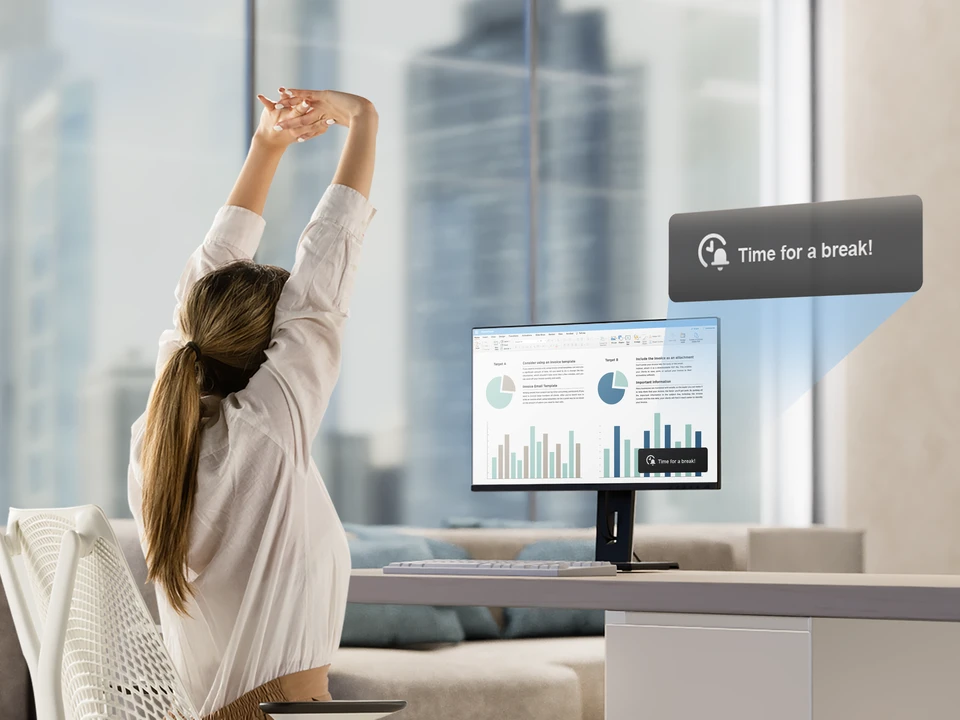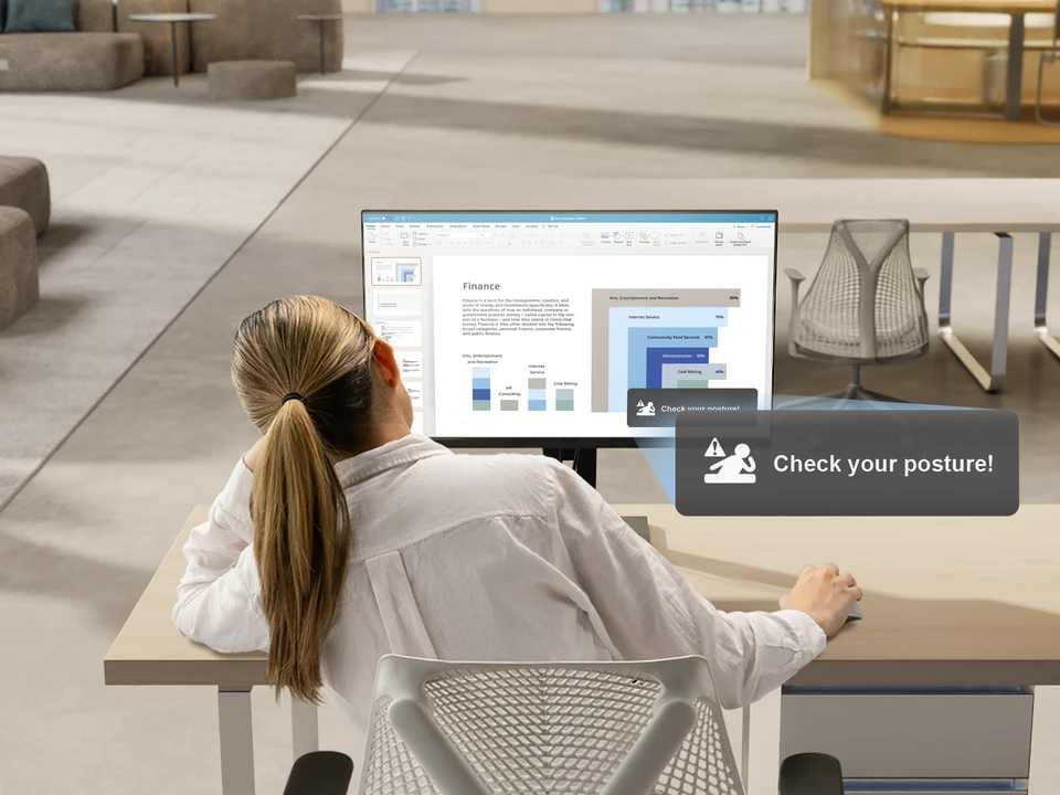 Kontrola postawy Oferuje delikatne przypomnienia, które pomogą Ci utrzymać zdrowe nawyki siedzenia przez cały dzień. Gdy wykryto złą postawę, komunikat na ekranie wywołuje szybkie dostosowanie się — co zwiększa komfort i dobre samopoczucie podczas dłuższego okresu pracy.