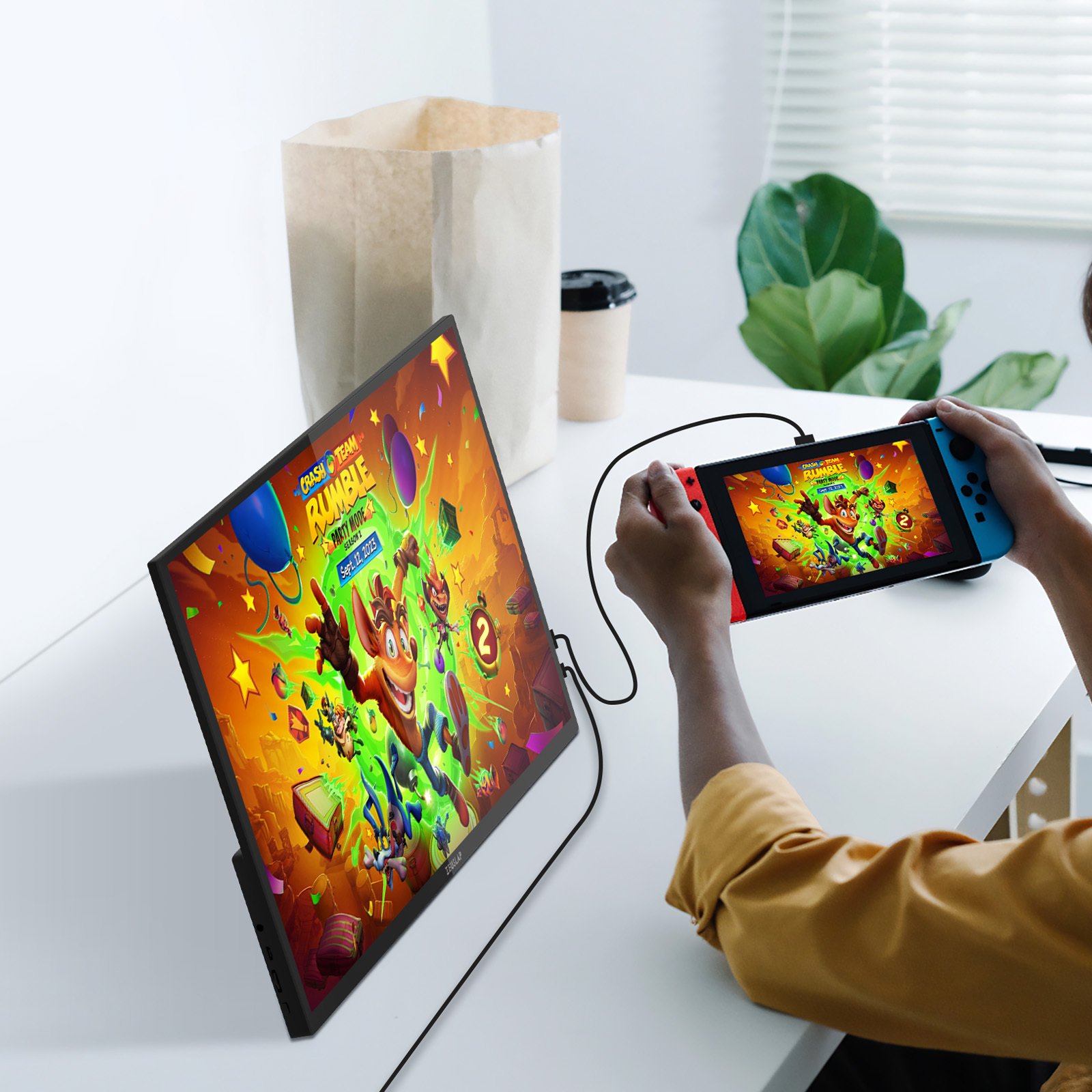 Port Mini HDMI (wersja 1.4, HDCP 1.4) obsługuje laptopy bez USB-C, komputery stacjonarne, PlayStation 4/5 i Xbox. Podłączasz kablem Mini HDMI do HDMI (w zestawie), dodajesz zasilanie przez USB-C i masz drugi ekran. Nintendo Switch działa przez USB-C – wyjmujesz konsolę z doka, podłączasz do monitora, zasilasz oryginalną ładowarką Nintendo (inne mogą nie wystarczyć) i grasz w trybie przenośnym na 16-calowym ekranie zamiast 6,2-calowego wbudowanego. Gniazdo audio 3,5 mm pozwala podłączyć słuchawki lub zewnętrzne głośniki – wbudowane stereo (2× 1W, 8Ω) gra wystarczająco głośno w cichym pomieszczeniu.