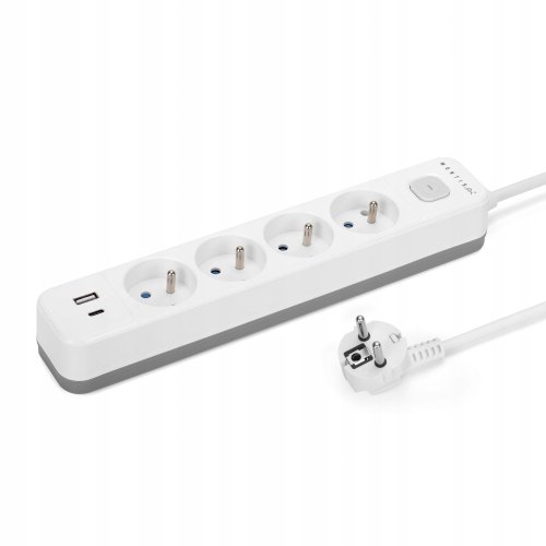 Przedłużacz wyróżnia się nowoczesnym, kompaktowym designem, który doskonale wpasuje się w każde wnętrze. Jego biało-szara kolorystyka sprawia, że jest estetyczny i łatwy do dopasowania do różnych aranżacji.