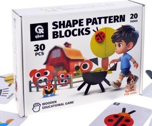 Kolorowa mozaika drewniana w kształcie od TM qbee składa się z 30 elementów, z których można ułożyć stylizowane wizerunki zwierząt, roślin, przedmiotów gospodarstwa domowego, cyfr i liter, kształtów geometrycznych, ozdób.