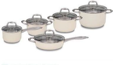 10-elementowy komplet garnków wykonanych ze stali nierdzewnej 18/10, szklane pokrywki z otworami pary, grubość ścianek naczyń 0.6 mm, przystosowane do wszystkich rodzajów kuchenek w tym indukcyjnych.