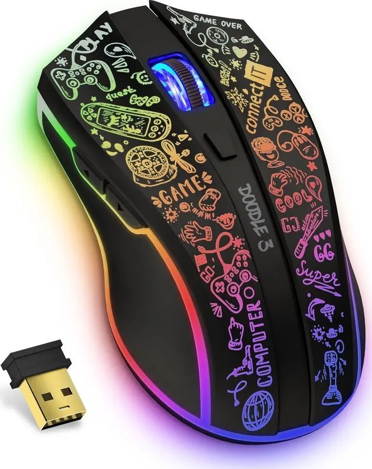 Mysz CONNECT IT Doodle 3 w eleganckim czarnym kolorze to niezwykłe urządzenie, które łączy komfort użytkowania z oryginalnym designem. Jej korpus zdobią drobne rysunki, a całość podkreśla efektowne podświetlenie w 7 kolorach tęczy, co nadaje jej niepowtarzalny wygląd. Myszka sprawdzi się zarówno w rękach graczy, jak i w biurze, oferując szereg funkcji, które zwiększają jej wszechstronność.
