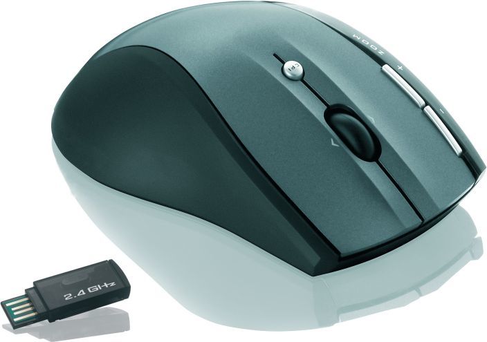 | Informacje dodatkowe | Precyzyjna bezprzewodowa mysz optyczna o ciekawym, ergonomicznym kształcie. Wykrywa ruch na większości powierzchni, m.in.: drewno, plastik, farba. Kształt dopasowany do prawej ręki. Programowalna rolka i klawisze dają możliwość przypisania różnych funkcji , szybkiego dostępu. Mysz posiada 4-kierunkową rolkę oraz dodatkowy przycisk CPI umożliwia zmianę rozdzielczości pomiędzy 1000 CPI, a 500 CPI. Technologia 2.4 GHz sprawia, że myszy nie trzeba synchronizować. Mysz zasilana jest dwoma bateriami typu AA. |
