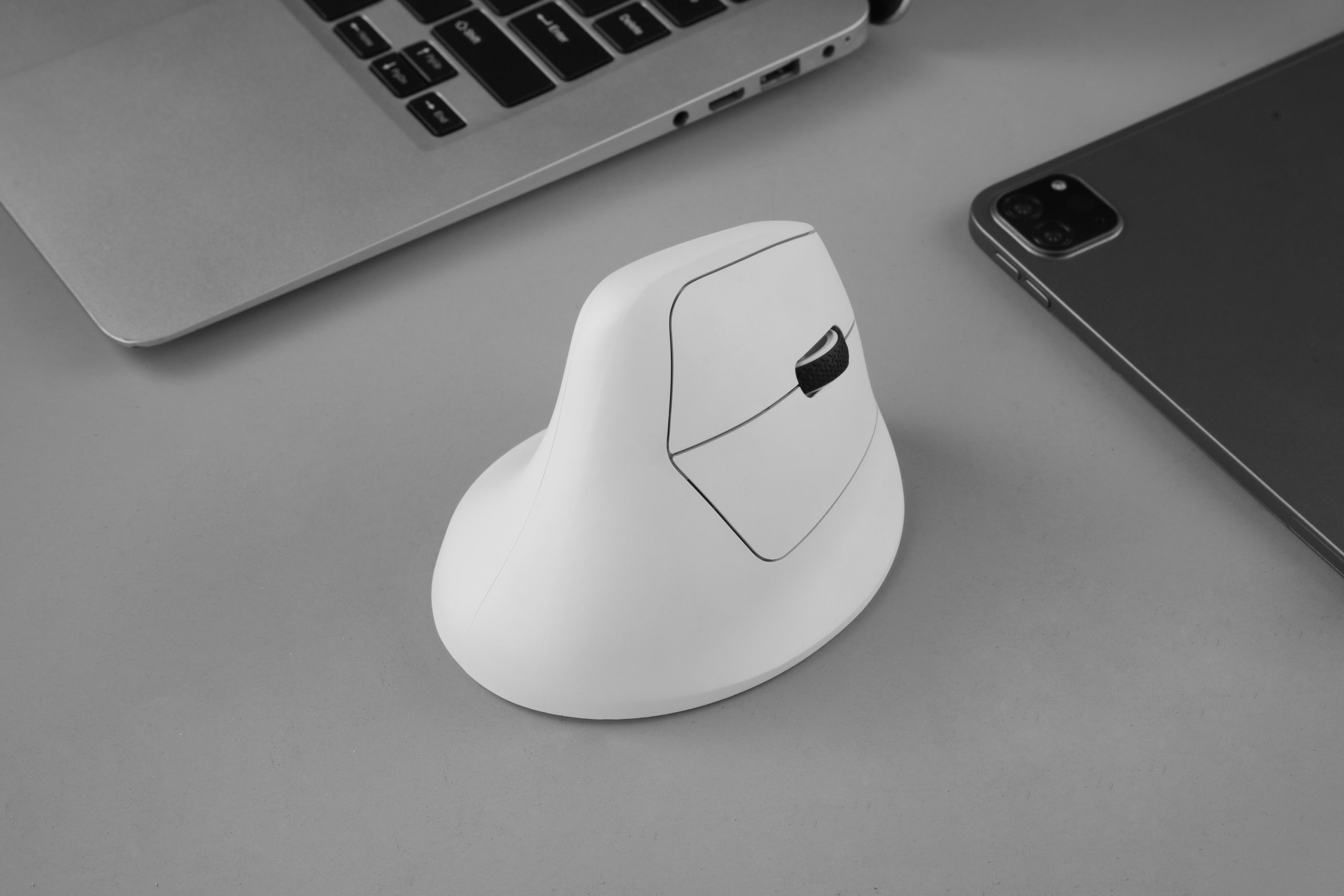 Konstrukcja o kącie nachylenia 47° pozwala ustawić dłoń w bardziej naturalnej pozycji niż w tradycyjnych myszach poziomych. Ogranicza to skręt przedramienia oraz napięcie w nadgarstku podczas wielogodzinnej pracy. Profilowana obudowa z podparciem kciuka poprawia stabilność chwytu i komfort użytkowania. Model przeznaczony jest dla osób praworęcznych.