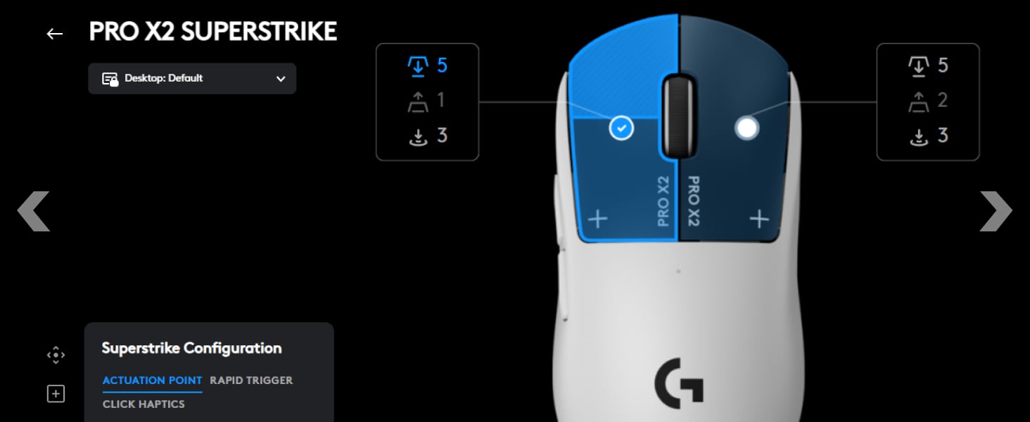 Wykorzystaj potęgę G HUB, aby ustawić aktywację, Rapid Trigger i haptykę. Dzięki pamięci wbudowanej Twoje ustawienia są zawsze pod ręką, oferując bezkompromisową wydajność natychmiast po podłączeniu myszy do dowolnego komputera.