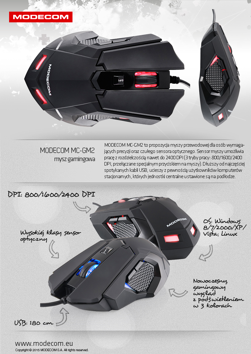 MODECOM MC-GM2 to propozycja myszy przewodowej dla osób wymagających precyzji oraz czułego sensora optycznego. Sensor myszy umożliwia pracę z rozdzielczością nawet do 2400 DPI (3 tryby pracy: 800/1600/2400 DPI, przełączane specjalnym przyciskiem na myszy). Dłuższy od najczęściej spotykanych kabli USB, ucieszy z pewnością użytkowników komputerów stacjonarnych, których jednostki centralne ustawione są na podłodze. Myszki MC-GM2 pokryte są specjalną powłoką, która zapewnia pewny chwyt myszki oraz sprawia, że jej trzymanie to czysta przyjemność. Dodatkowo mysz oferuje szereg funkcji multimedialnych oraz wspomagające pracę z systemem Windows.