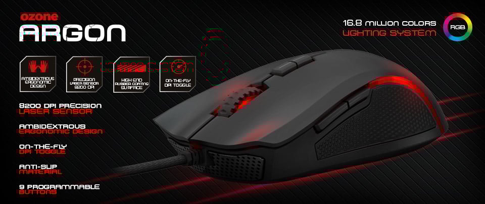 Ozone to producent znany ze współpracy z najlepszymi klanami gamingowymi przy projektowaniu swojego sprzętu. Tym razem rezentuje on na rynek polski laserową myszkę -Ozone Argon. Mysz została stworzona razem z jednym z najbardziej znanych graczy League of Legends - Carlosem „Ocelote” Rodrigezem . Praca nad tym modelem przebiegała wiele miesięcy po to, by znaleźć najbardziej ergonomiczny kształt. Ma to szczególne znaczenie przy dłuższym graniu lub siedzeniu przed komputerem. Ozone Argon wyprofilowano tak, aby zmniejszyć do minimum ryzyko wystąpienia bólu nadgarstka. Waży ona 125g, a dodatkowo w środku znajdziemy jeszcze cztery odważniki po 4.5g. Gracz może w tym momencie regulować bardziej wagę myszki w zależności czy gra w szybką strzelankę czy wolniejszą strategię.
