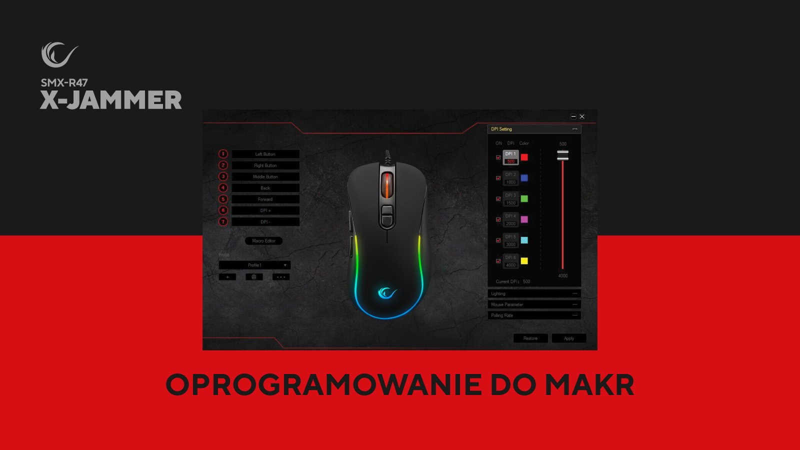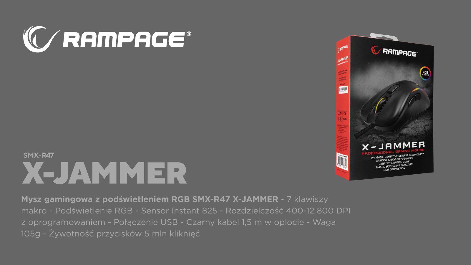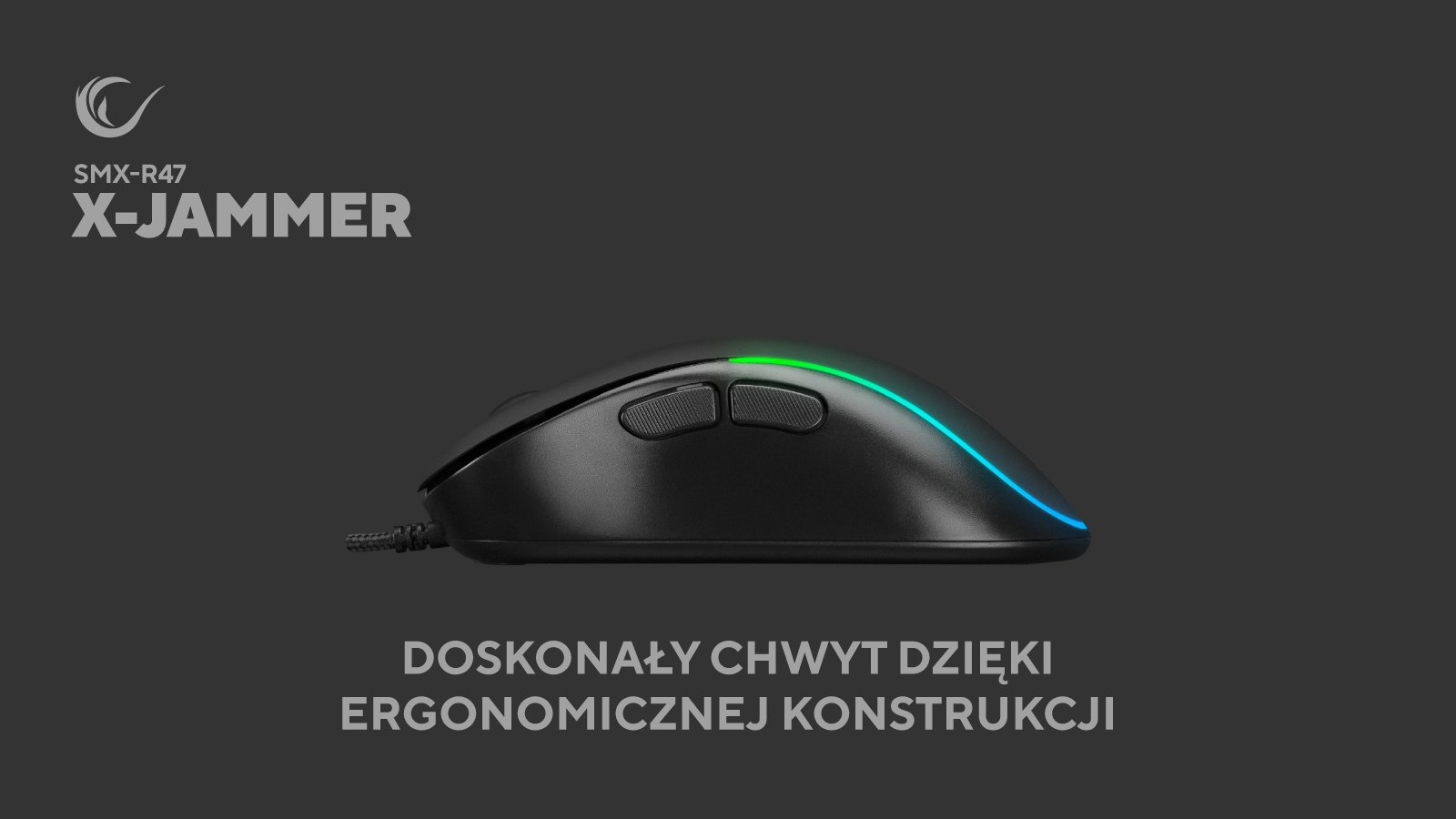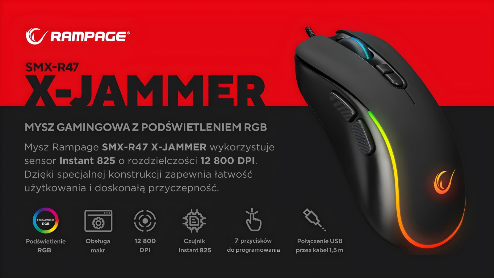 Myszka Rampage X-JAMMER wygląda stylowo dzięki podświetleniu RGB, ten produkt został zaprojektowany z najwyższą starannością, aby zadowolić Cię wizualnie. Przodująca w swojej klasie mysz gamingowa SMX-R47 X-JAMMER stanie się Twoim nieodłącznym towarzyszem.