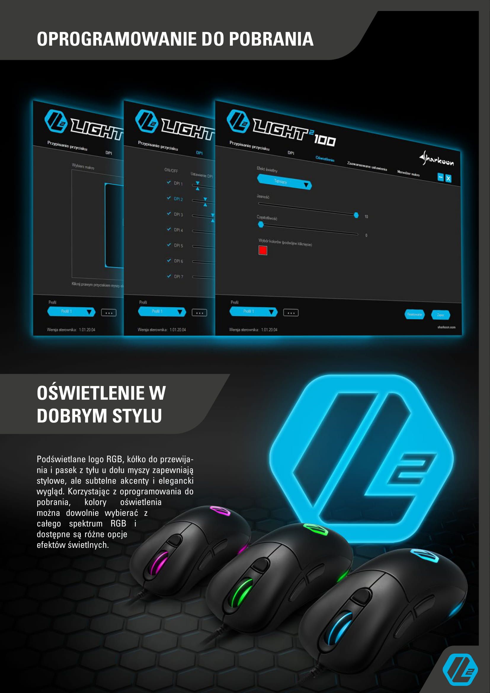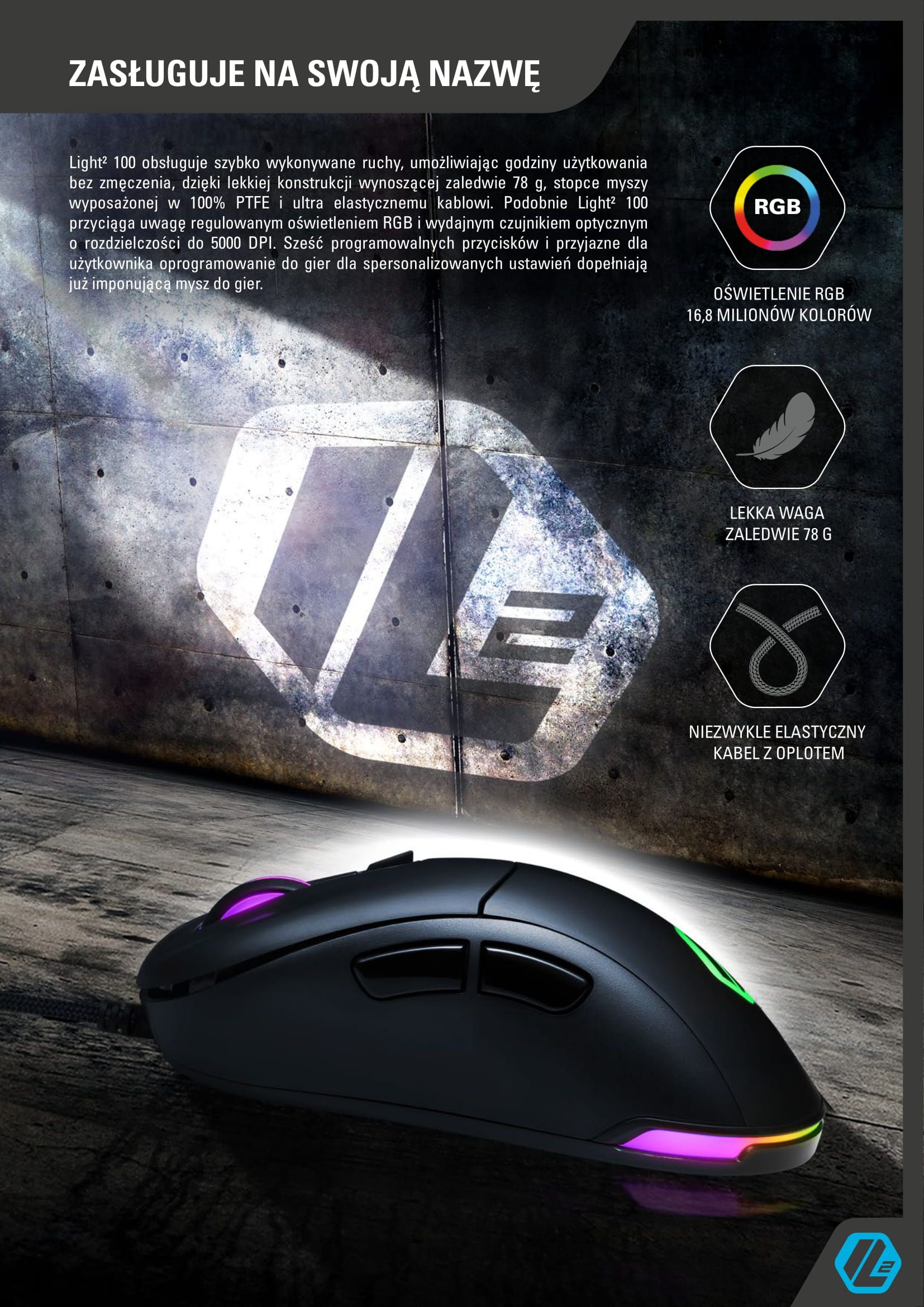 Nie tylko klawiatura może zaoferować efektowne podświetlenie. Ten model myszki dla graczy wyposażono w podświetlenie RGB, które przyciąga spojrzenie i sprawia, że stanowisko gamingowe prezentuje się jeszcze bardziej imponująco. Steruj podświetleniem myszki, dopasuj je do kolorystyki otoczenia lub postaw na minimalizm – ten model myszki daje użytkownikowi naprawdę wiele swobody w tym zakresie.