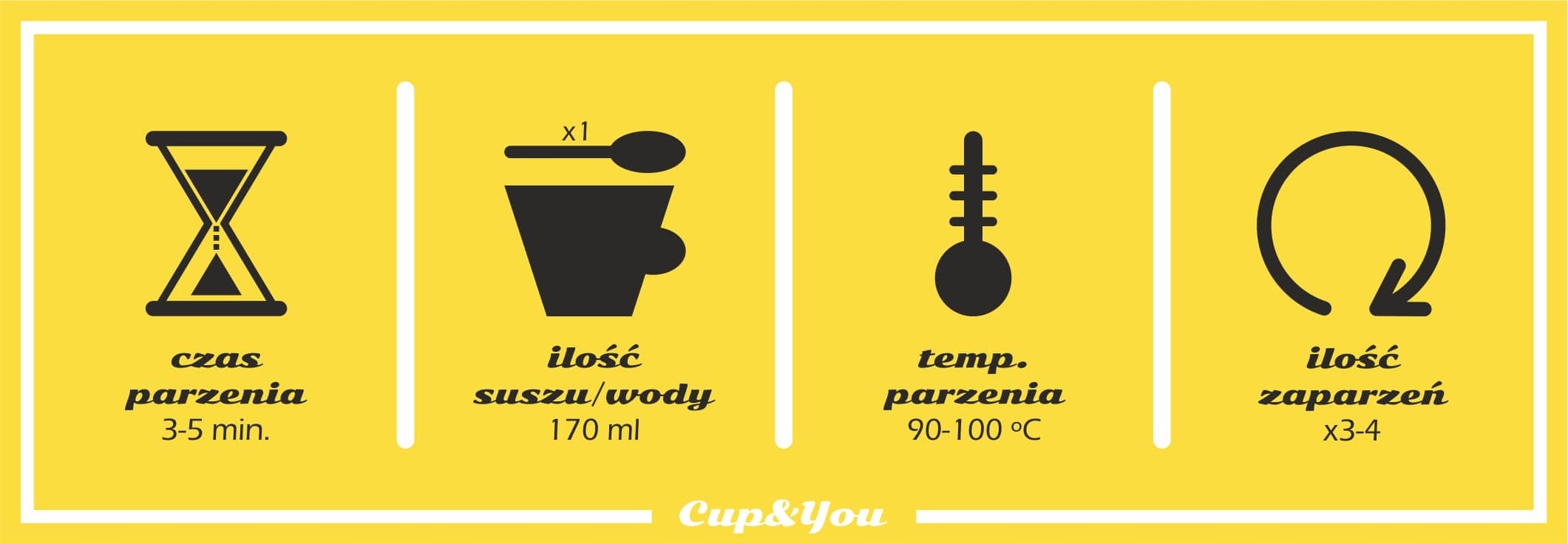 Parzymy wodą o temperaturze 90°-100° C, 3-5 minut (w zależności od upodobań związanych z intensywnością naparu), 1 łyżeczka suszu na 170ml wody (mała filiżanka), możemy parzyć 3-4 razy.