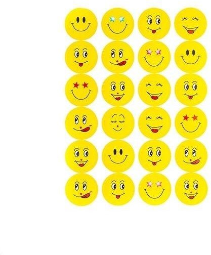 Zestaw naklejek motywacyjnych z uśmiechniętymi buźkami, w różnych wersjach (1,5 cm), w intensywnym, żółtym kolorze.