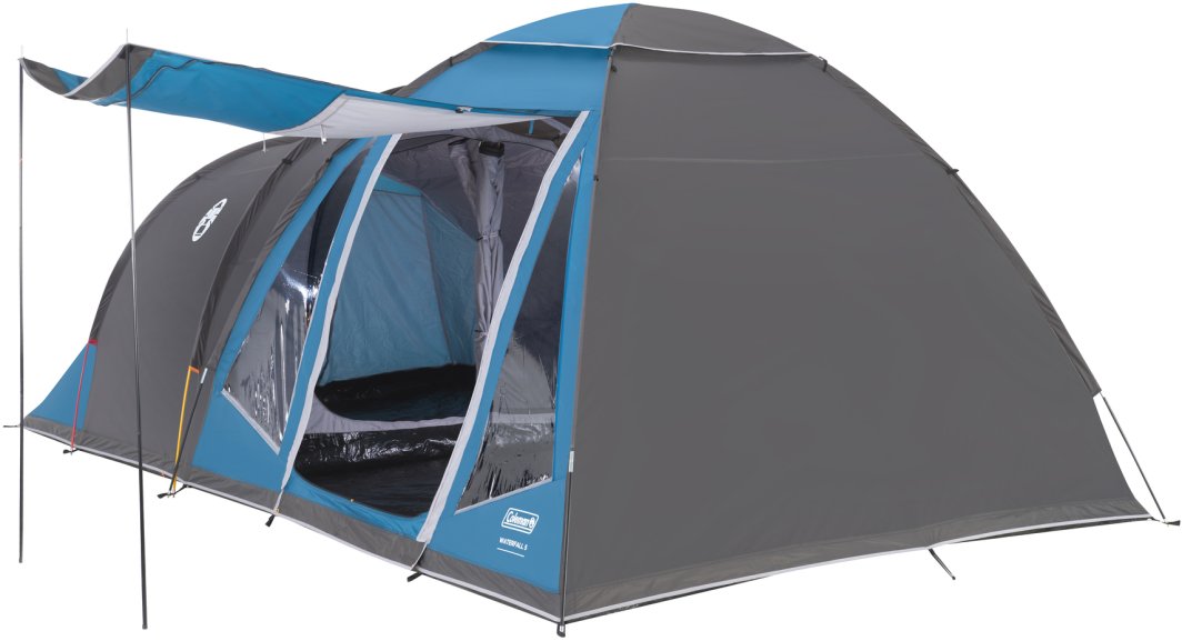 Coleman Waterfall 5 to pięcioosobowy namiot rodzinny charakteryzujący się hybrydową konstrukcją, która łączy elementy budowy tunelowej oraz kopułowej. Centralna część mieszkalna w kształcie kopuły oferuje dużą przestrzeń i równą wysokość na całej powierzchni, co pozwala na swobodne poruszanie się wewnątrz. Model posiada dwie oddzielne sypialnie, zapewniające prywatność użytkownikom, oraz wysoki, przestronny przedsionek wyposażony w praktyczne wejście na kabel zasilający. W zestawie znajdują się dwa stalowe słupki, które umożliwiają rozstawienie przedniego daszku, tworząc dodatkową przestrzeń osłoniętą przed deszczem.