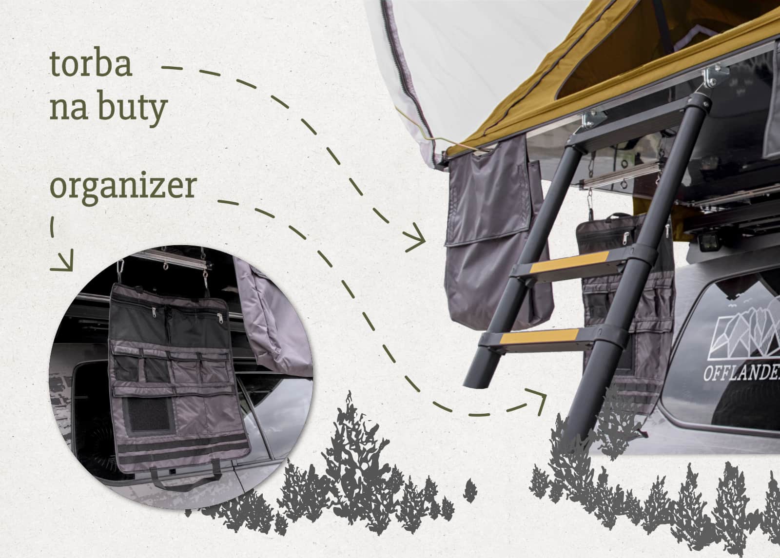 Do namiotu dołączona jest także składana aluminiowa drabinka. Jest ona na stałe wbudowana do podłogi namiotu i chowa się w pokrywie przy składaniu. Drabinka ma dwa blokowane stopnie ułatwiające poziomowanie podłogi namiotu na nierównym terenie.