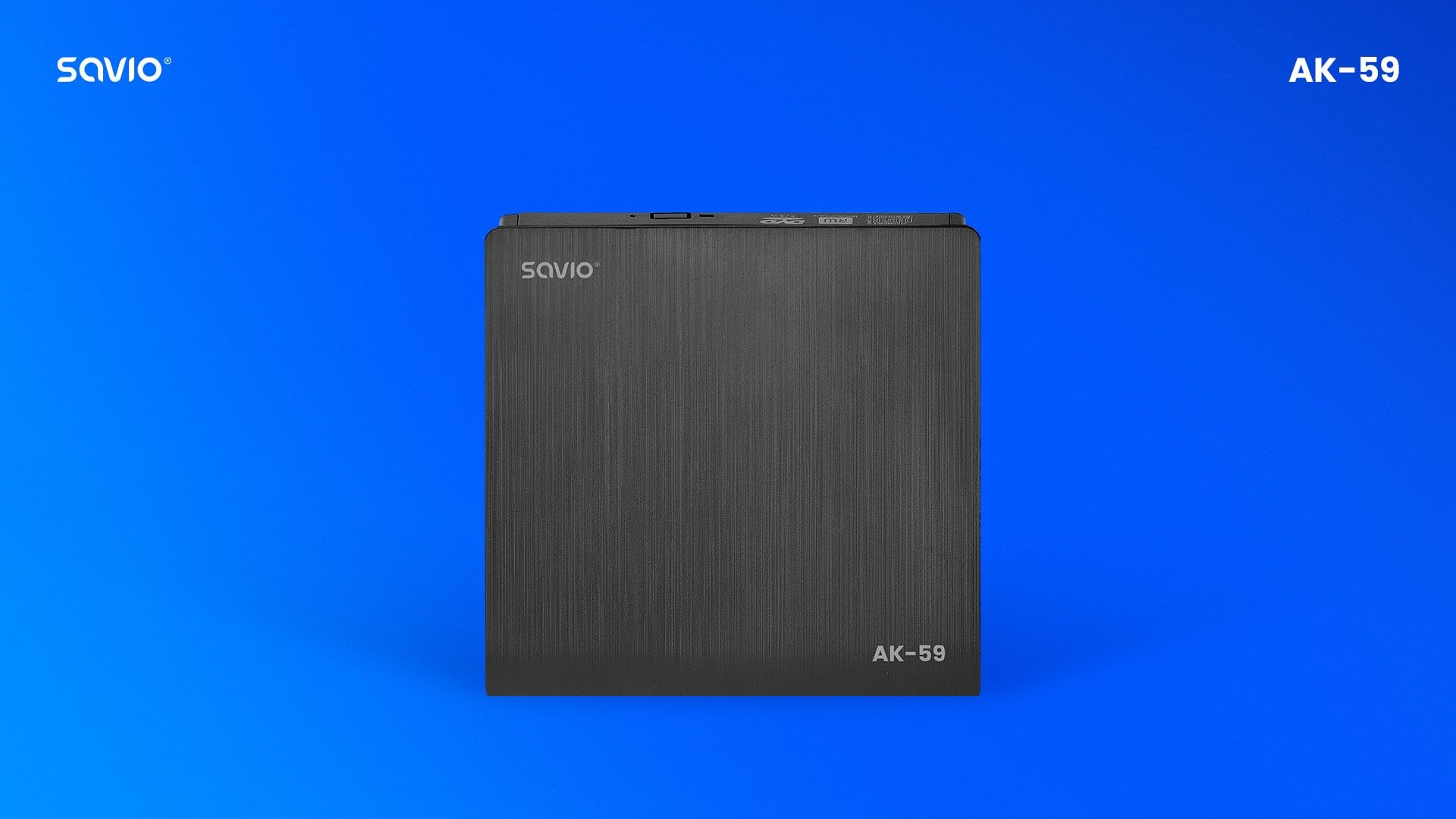 Zewnętrzna nagrywarka typu SLIM AK-59 jest zewnętrznym napędem optycznym, który pozwala zarówno odtwarzać, jak i nagrywać dane na nośniki CD/DVD. Kompaktowa obudowa typu slim sprawia, że urządzenie może być z łatwością przenoszone i przechowywane. Savio AK-59 umożliwia nagrywanie oraz odtwarzanie zarówno płyt CD z prędkościami do 24x, jak i DVD z prędkościami do 8x. Obsługuje także nośniki typu RW, dzięki czemu możliwe jest wielokrotne zapisywanie i usuwanie danych na przeznaczonych do tego płytach.