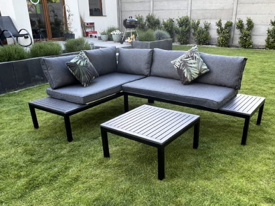 Narożnik balkonowy z eleganckiej stali w kolorze czarnym to znakomite rozwiązanie dla tych, którzy pragną stworzyć komfortową przestrzeń do wypoczynku na świeżym powietrzu. Zestaw składający się z dwóch sof z oparciami oraz praktycznego stolika kawowego zapewnia idealne warunki do relaksu w ogrodzie lub na balkonie.
