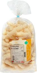 To doskonała i zdrowa przekąska. Doskonale smakuje i z powodzeniem zastąpi chipsy i inne równie niezdrowe chrupki. Można dodawać do jogurtu lub mleka. Chrupki otrzymywane są z prostych wyselekcjonowanych surowców najwyższej jakości. Wyprodukowane są bez użycia jakichkolwiek przypraw, olejów, sera i ich pochodnych. Skład: ekstrudowana kasza ryżowa. Wartość odżywcza w 100 g: Wartość energetyczna - 381kcal(1599 kJ) kJ / kcal tłuszcz - 0,79 g węglowodany - 83,84 g białko - 8,48 g Waga: 75g